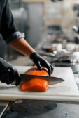 Zdjęcie "Szef kuchni kroił świeże bułki sushi ostrym nożem na desce do krojenia w restauracji. ręce do góry" może być wykorzystywane do celów osobistych i komercyjnych zgodnie z warunkami zakupionej licencji Royalty-free. Obraz jest dostępny do pobrania w jakości wysokiej rozdzielczości do 5760x3840.
