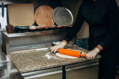 Zdjęcie "Samiec szefa kuchni robi sushi i bułki z ryżu, czerwonej ryby i awokado. Białe rękawiczki. Ciemne tło." może być wykorzystywane do celów osobistych i komercyjnych zgodnie z warunkami zakupionej licencji Royalty-free. Obraz jest dostępny do pobrania w jakości wysokiej rozdzielczości do 5760x3840.
