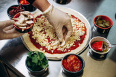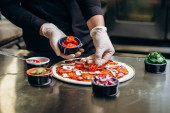 Samiec szefa kuchni robi sushi i bułki z ryżu, czerwonej ryby i awokado. Białe rękawiczki. Ciemne tło.