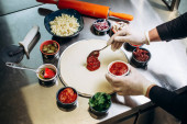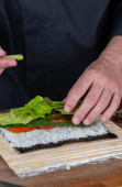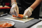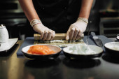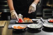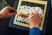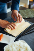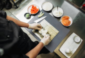 Zbliżenie rąk szefa kuchni przygotowujących japońskie jedzenie. Widok z góry