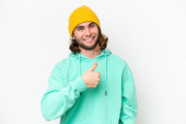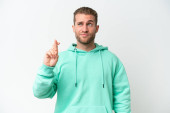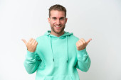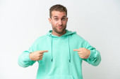 młody przystojny biały mężczyzna odizolowany na biały tło wskazując palec w boki i szczęśliwy