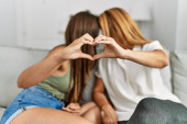 Młoda Latynoska para uśmiechnięta szczęśliwa robiąc symbol serca rękami w domu.