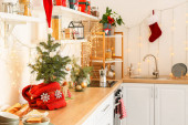 Nowoczesna kuchnia Wnętrze z wyspy, zlewozmywak, szafki w nowym luksusowym domu urządzone w stylu Bożego Narodzenia. Zdjęcie pionowe