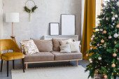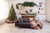 Wnętrze nowoczesnego salonu typu studio z wygodną sofą ozdobioną choinkami i prezentami. Obraz pionowy