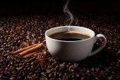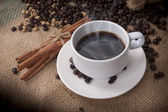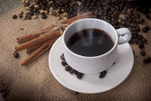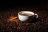 Martwa natura z filiżankę czarnej kawy i palonych ziaren kawy