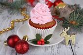 Ciasto z kremem na talerzyk z Bożego Narodzenia ozdoba na drewnianym stole tło