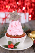 Pyszne ciasto na talerzyk z holly i jagoda na jasnym tle ozdoba Bożego Narodzenia