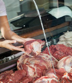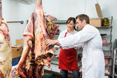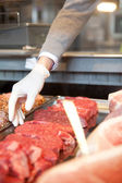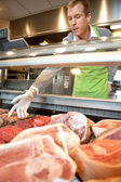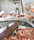 Mężczyzna sprzedaży świeżych pakowanych kiełbas do klienta