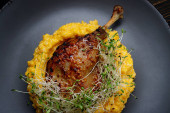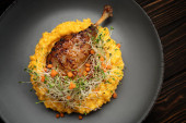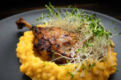 Noga kaczki z risotto, dynią i ziołami na ciemnym tle
