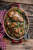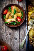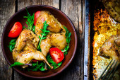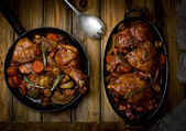 kurczak z pieczarkami i warzywami, duszona w winie.