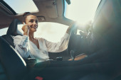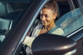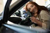 Uśmiechnięta młoda kobieta siedząca przy kierownicy nowego pojazdu silnikowego
