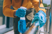 Zdjęcie "Dwie sprzątaczki dezynfekują stoliki w obszarze współpracowników specjalnymi produktami, noszą ochronne gumowe rękawiczki" może być wykorzystywane do celów osobistych i komercyjnych zgodnie z warunkami zakupionej licencji Royalty-free. Obraz jest dostępny do pobrania w jakości wysokiej rozdzielczości do 5760x3840.