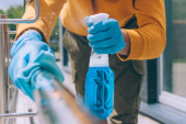 Dwie sprzątaczki dezynfekują stoliki w obszarze współpracowników specjalnymi produktami, noszą ochronne gumowe rękawiczki