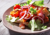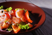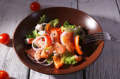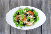 Świeże ryby sałatka z warzyw na talerzu na drewniany stół szczegół