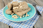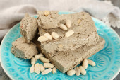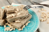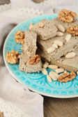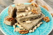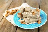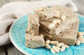 Chałwa słonecznikowa z orzeszków ziemnych na talerzu, na tle drewniane