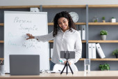 Szczęśliwa piękna brunetka młoda kobieta influencer fotograf pracuje w biurze, siedzi przy biurku przed laptopem z aparatem i różnymi soczewkami na, uśmiecha się do kamery, przestrzeń kopiowania