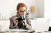 Zdjęcie "Szczęśliwy twórczy millennail kobieta fotograf pracuje w studio biurowym, siedzi przy biurku z nowoczesnym laptopem na, trzyma profesjonalny aparat, pije kawę, sprawdza zdjęcia, przestrzeń do kopiowania" może być wykorzystywane do celów osobistych i komercyjnych zgodnie z warunkami zakupionej licencji Royalty-free. Obraz jest dostępny do pobrania w jakości wysokiej rozdzielczości do 5760x3840.