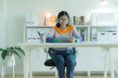 Zdjęcie "Młody projektant mody w okularach rozmawiający przez telefon i sprawdzający projekty na laptopie Podczas pracy nad szkicami odzieżowymi, stań przy stole ze sprzętem do szycia." może być wykorzystywane do celów osobistych i komercyjnych zgodnie z warunkami zakupionej licencji Royalty-free. Obraz jest dostępny do pobrania w jakości wysokiej rozdzielczości do 5760x3840.