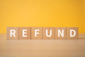 Drewniane bloki z tekstem pojęcia "REFUND" i monetami.