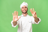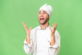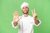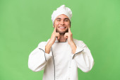 młody przystojny szef kuchni człowiek na odizolowane tło pokazuje ok znak i kciuk w górę gest