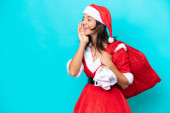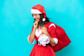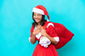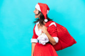 Młoda Latynoska kobieta ubrana jak mama Noel trzyma worek odizolowany na niebieskim tle i patrzy w górę