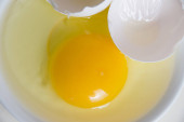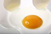 Żółtko jaj i skorupa na płytce izolatu na białym tle.