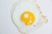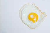 Smażone jajko na białej płytce izolować na białym tle płaski widok góry, kopiowanie tła przestrzeni.