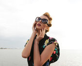 piękna dziewczyna w okulary na tle niebieskiego nieba
