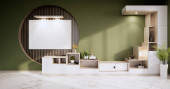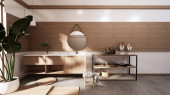 Drewniana szafka w pustym pokoju Muji, minimalistyczne wzory Japandi. Renderowanie 3D