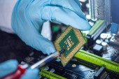 Elektroniczny inżynier trzymający chip komputerowy. Układ scalony do płytki głównej PC. Chip procesora. Elementy elektroniczne. Komputery. Koncepcja chipu, półprzewodnika i wojny handlowej.