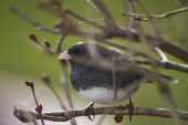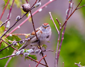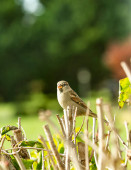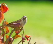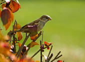 Pojedynczy wróbel w sezonie jesiennym siedzi na gałęziach. Czerwone liście na krzewie.