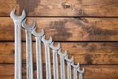 Silny mężczyzna w czerwonej rękawiczce trzyma klucz na czarnym tle. Koncepcja prac hydraulicznych, mechanicznych i motoryzacyjnych.