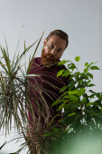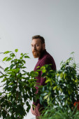 Brodaty mężczyzna w burgundowym swetrze odwracając wzrok od roślin odizolowanych na czarno