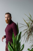 Stylowy brodaty mężczyzna odwracając wzrok od zielonych roślin odizolowanych na czarno, sztandar