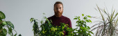 Stylowy mężczyzna w swetrze patrzący w kamerę w pobliżu rozmytych tropikalnych roślin odizolowanych na czarno, sztandar