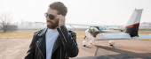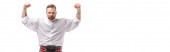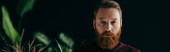 brodaty mężczyzna patrząc na kamerę w pobliżu różnych roślin izolowanych na szarości, sztandar