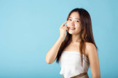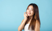 Asian young woman are not very beautiful hold jar of skin cream for face and apply anti-aging moisturizer studio isolated on blue background, Happy female pointing finger her face, pursuit of beauty