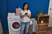 Młoda latynoska brunetka wkładająca ubrania do pralki podczas prania w domu