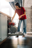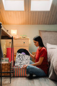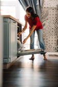 Młoda latynoska brunetka wkładająca ubrania do pralki podczas prania w domu