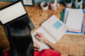 Młoda Latynoska zapisuje notatki podczas pracy z laptopem w domu