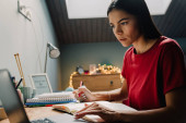 Młoda Latynoska zapisuje notatki podczas pracy z laptopem w domu