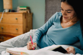 Młoda Latynoska zapisuje notatki u organizatora podczas pracy na laptopie w domu