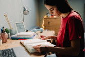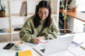 Młoda Latynoska zapisuje notatki u organizatora podczas pracy na laptopie w domu