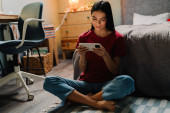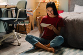 Zdjęcie "Młoda latynoska kobieta pracuje z laptopem siedząc na podłodze w domu" może być wykorzystywane do celów osobistych i komercyjnych zgodnie z warunkami zakupionej licencji Royalty-free. Obraz jest dostępny do pobrania w jakości wysokiej rozdzielczości do 5760x3840.