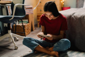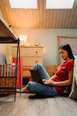 Młoda latynoska kobieta pracuje z laptopem siedząc na podłodze w domu