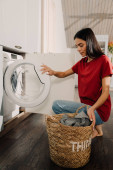Młoda Latynoska badająca swoją kolekcję winyli siedząc na podłodze w domu