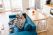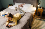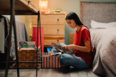 Młoda Latynoska kobieta korzystająca z telefonu komórkowego siedząc na krześle w sypialni w domu