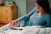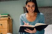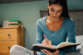 Młoda Latynoska zapisuje notatki u organizatora leżąc w łóżku w domu