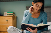 Zdjęcie "Młoda Latynoska zapisuje notatki u organizatora leżąc w łóżku w domu" może być wykorzystywane do celów osobistych i komercyjnych zgodnie z warunkami zakupionej licencji Royalty-free. Obraz jest dostępny do pobrania w jakości wysokiej rozdzielczości do 5760x3840.