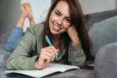 Młoda Latynoska zapisuje notatki u organizatora leżąc w łóżku w domu